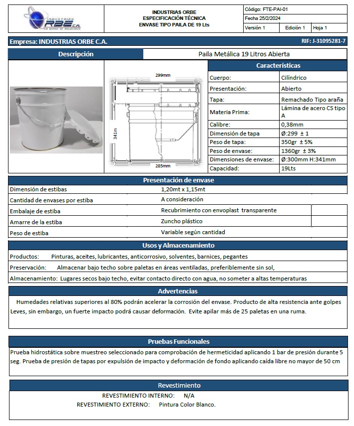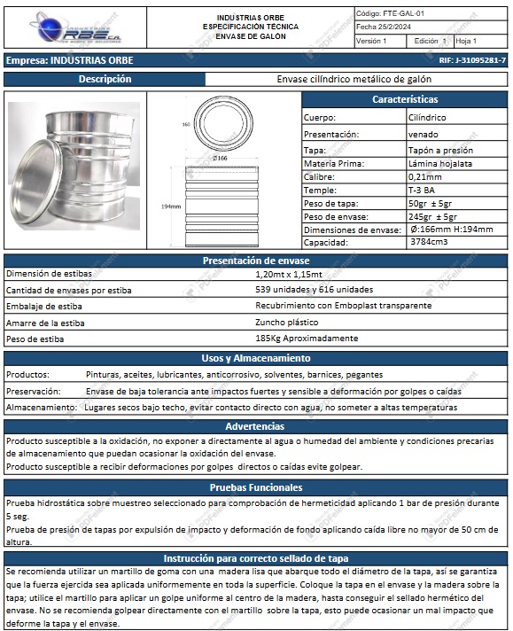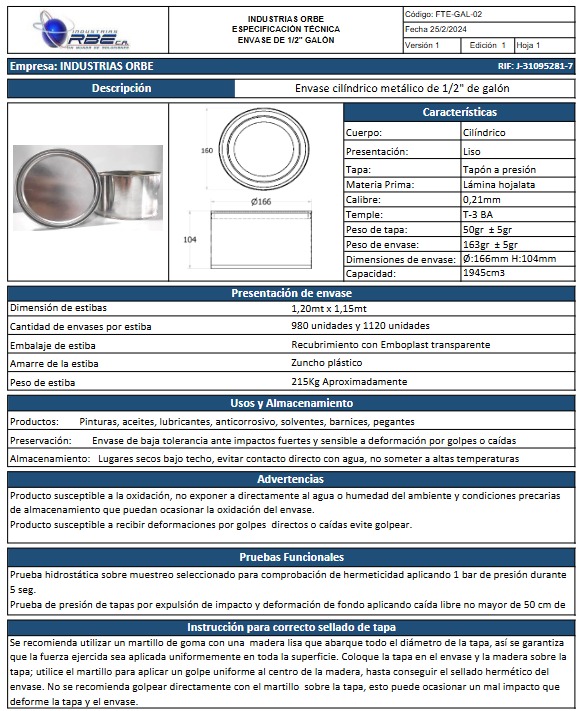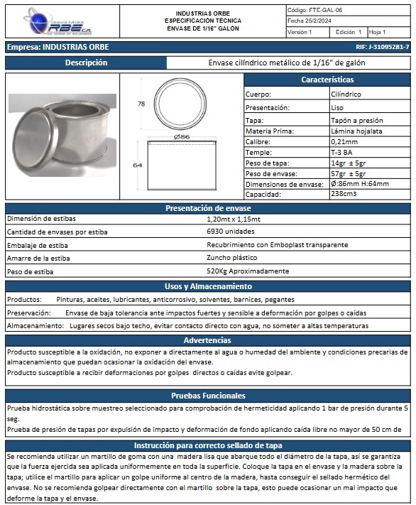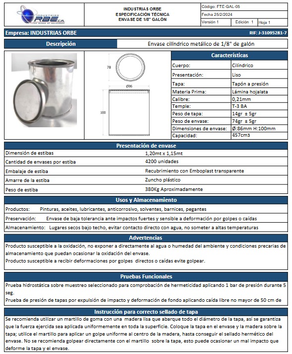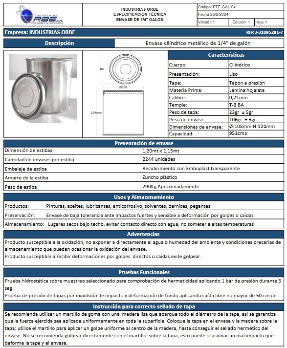 En Industrias Orbe fabricamos envases metálicos en hojalata estañada brillante, diseñados para garantizar resistencia, hermeticidad y una presentación impecable. Ideales para pinturas, masillas, selladores, lacas y recubrimientos industriales, nuestros envases aseguran la conservación del producto y proyectan la calidad de su marca con confianza y durabilidad. Estamos en capacidad de producir otras medidas de envases de acuerdo a sus requerimientos.